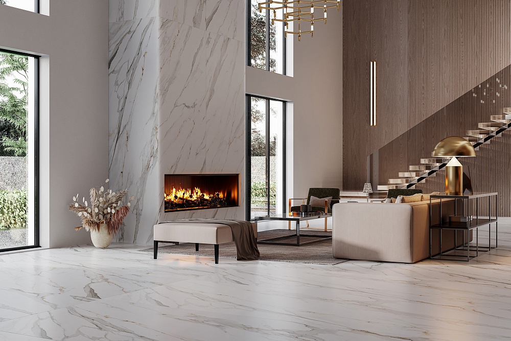 Калакатта Голд — это залитое солнечным светом утро в Сен-Тропе. Чистый белый фон и яркие сверкающие прожилки напоминают о золотом песке и солнечных бликах на поверхности воды.